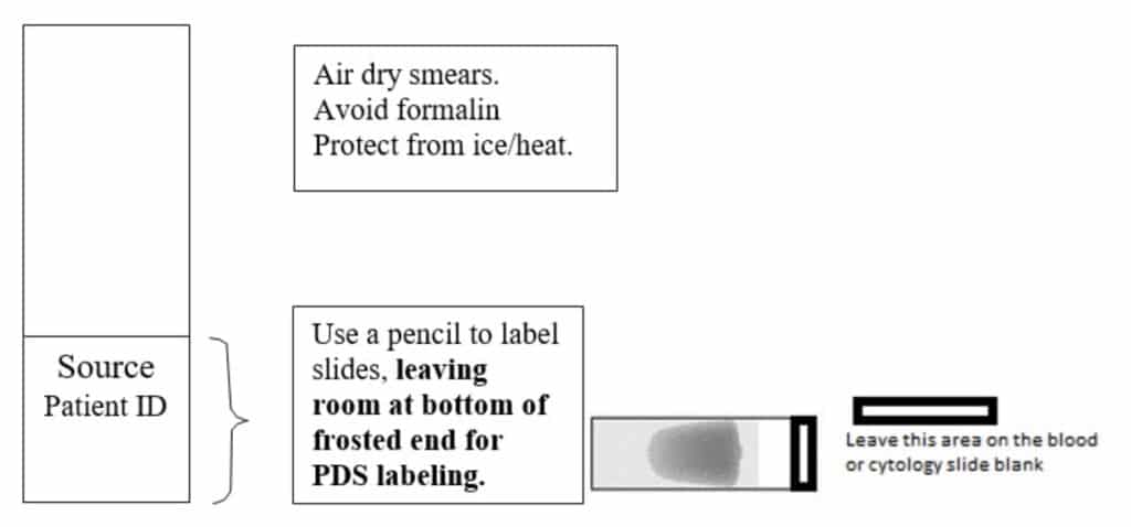 - Blood/cytology slides must be clearly labeled – refer to Labeling Blood/Cytology Smears above. Slides must be kept separate from formalin-containing vessels, as contact will adversely affect staining. Package appropriately to prevent breakage during transit.