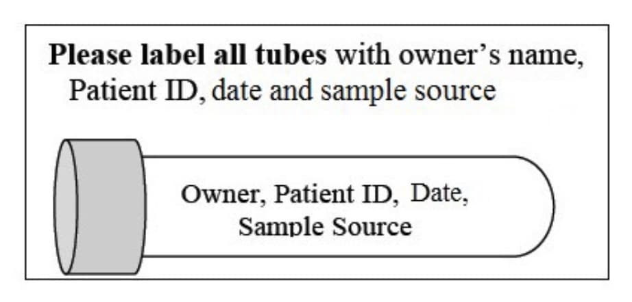 All samples must be properly labeled with the patient’s identification, the owner’s last name, and source (site). This includes cytology smears and tubes. For cytology smears taken from multiple sites, each slide must be labeled to indicate the corresponding site.