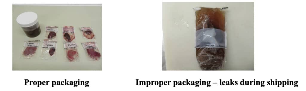 - Use leak-proof, rigid containers with tight-fitting lids, and place these in zip-lock bags – refer to Sample Packaging Protocol below.